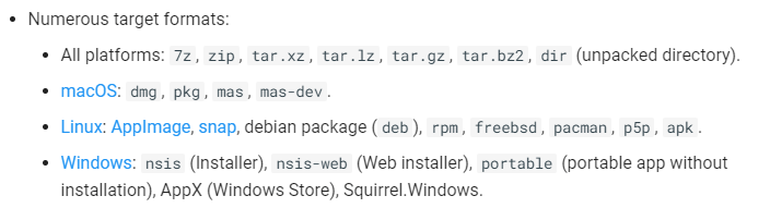 Those options all accept an additional packaging format. You can find those on the electron-builder homepage: